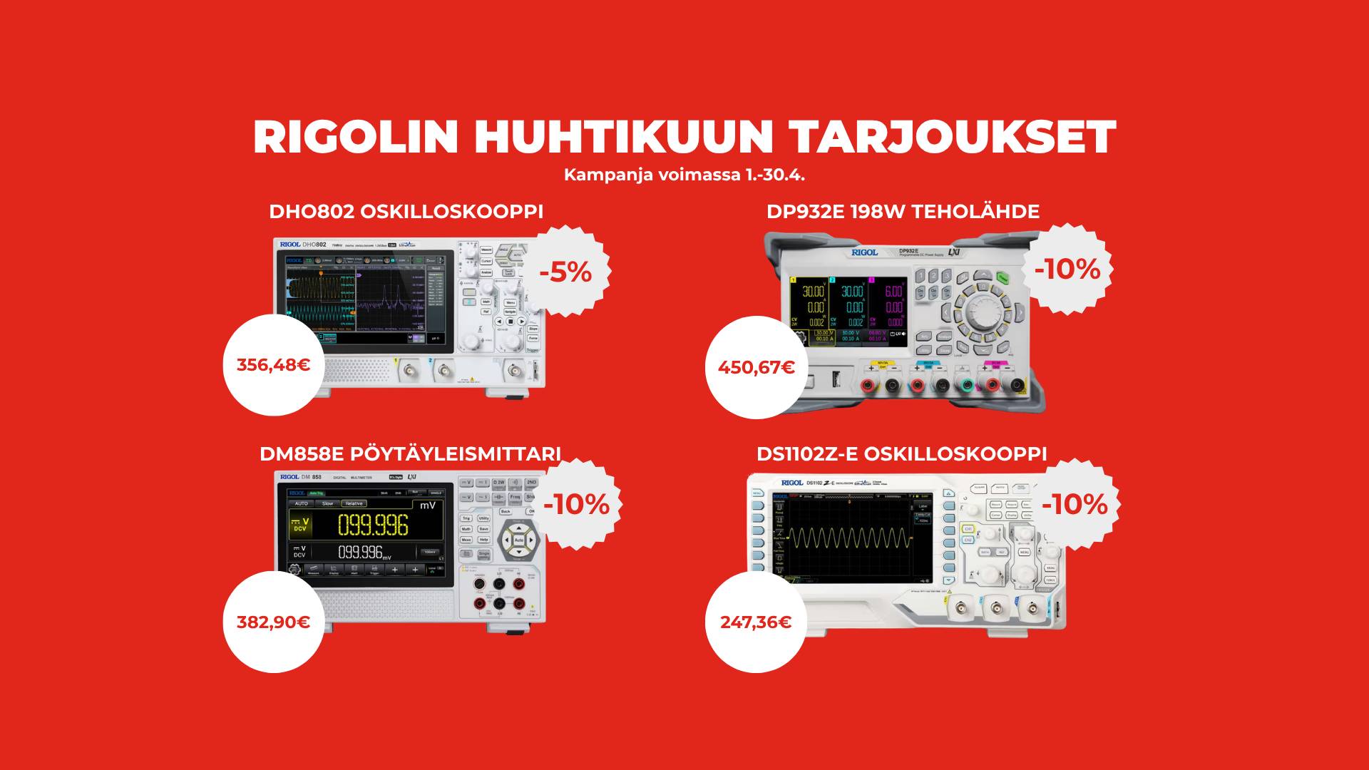 Rigolin huhtikuun kampanja tarjoaa valikoidut mittalaitteet erikoishinnoin koko kuukauden ajan. Oskilloskoopit, teholähteet ja yleismittarit ovat saatavilla kampanjahinnoilla 1.–30.4.