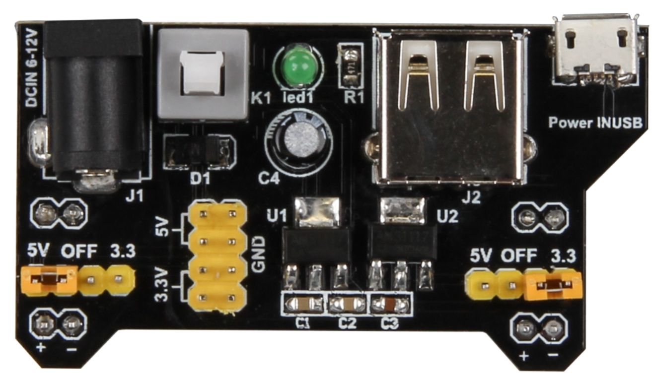 Joy-IT SBC-POW-BB - Tällä moduulilla saat helposti syötettyä 3,3 tai 5V käyttöjännitteen leipälaudallesi.