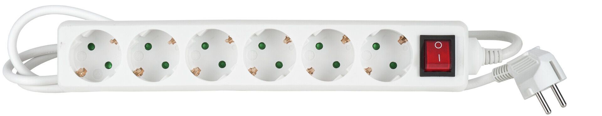 Airam 2442648 - Kuusiosainen, valkoinen, suojamaadoitettu jatkojohto punaisella kytkimellä. Johdon pituus 5,0m.
