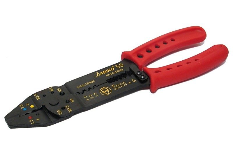 Aito ja alkuperäinen puristuspihti 0,5 - 6,0 mm2 eristetyille ja 1,5 - 6,0 mm2 eristämättömille Abiko-liittimille. Puristus, leikkaus, kuorinta, ruuvinkatkaisu, ...