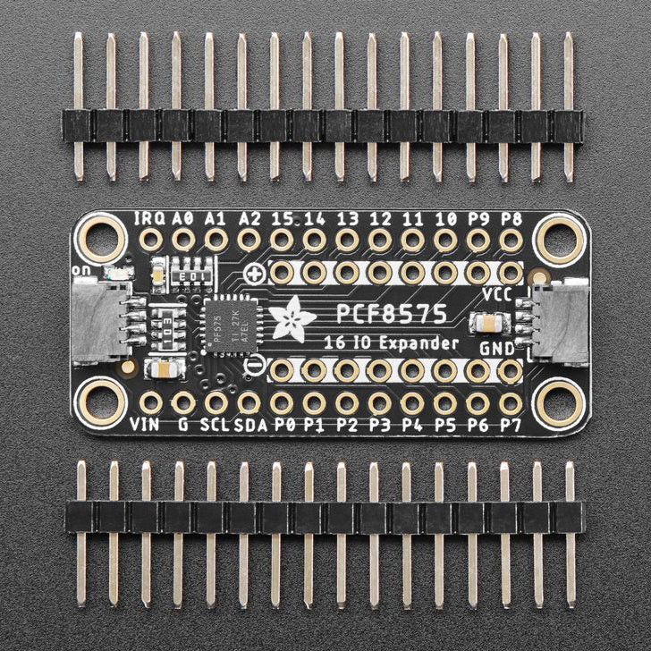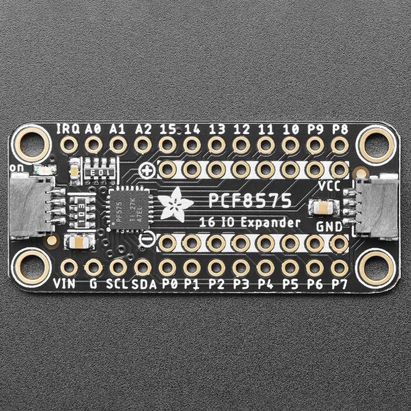 Adafruit PCF8575 - GPIO laajennuskortti lisää 16 I/O-kanavaa I2C-väylän kautta. Tukee jopa 8 laajenninta samalle väylälle (64 GPIO). Pinnejä voi käyttää tuloina tai ulostuloina erikoisella "kevyt ylävetoresistori / vahva maataso" -toiminnalla. Helppo liittää STEMMA QT/Qwiic -liittimillä.
