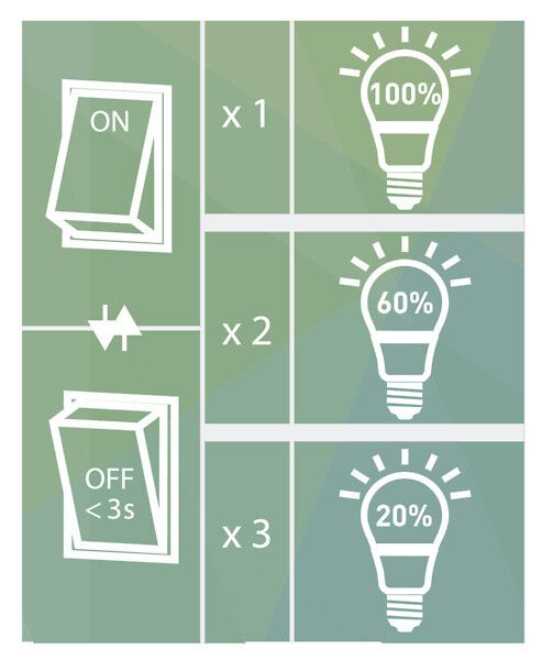 Sarjan lamppujen himmentäminen ei voisi olla helpompaa! Et tarvitse sähköasennusta tai himmentimiä. Lamppujen valotasoa voi kontrolloida tavallisella kytkimellä.