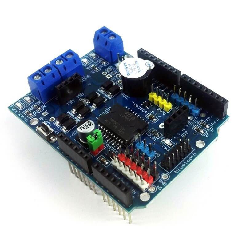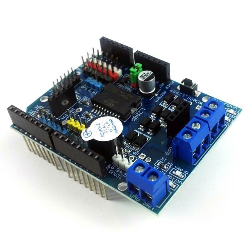 This multi-featured motor shield based around the L298P driver chip fits onto Arduino Uno or other Arduino UNO compatible boards.