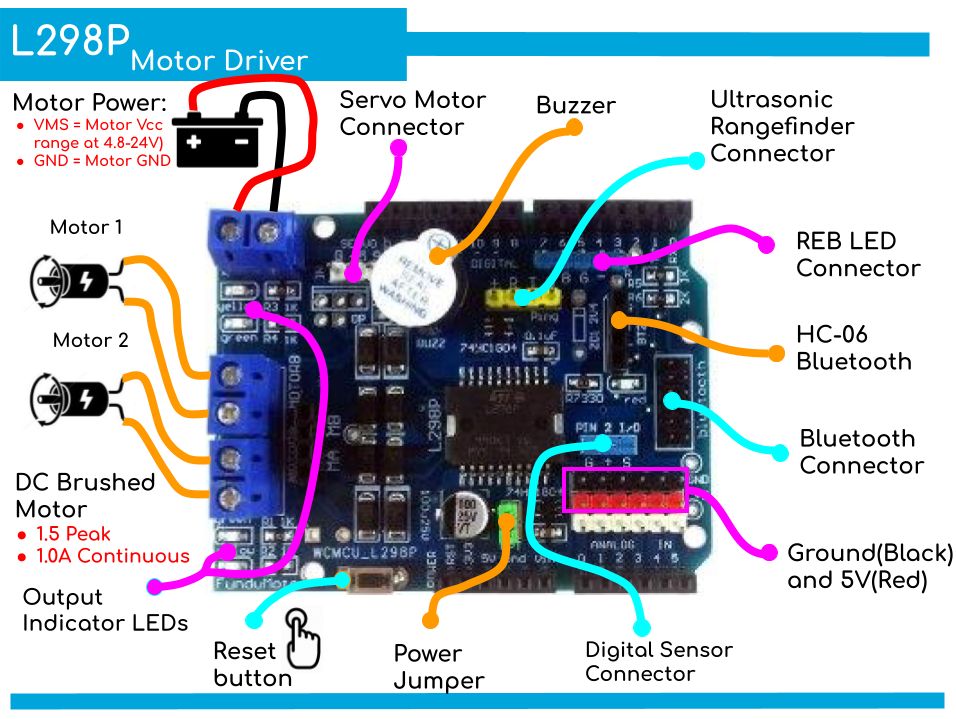 Besides the L298P driver IC, it comes with tones of header pins and female header for GPIO of Arduino. The ADC pins of Arduino main board are being extended to SVG (Signal Voltage Ground), RC servo alike header pins. Making it simple for you to connect to sensor module with the extra pin of GND and 5V.