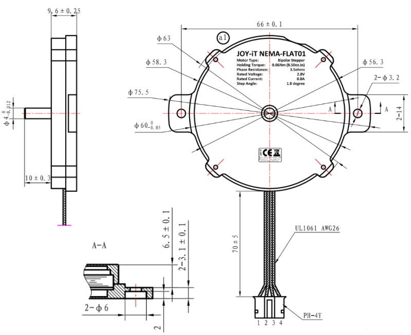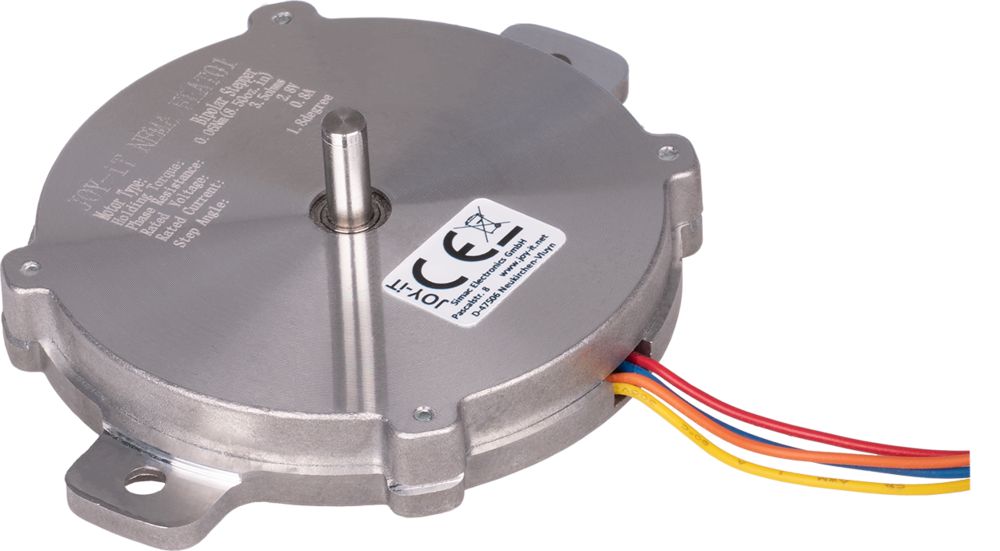 Joy-IT NEMA-FLAT01 - 57SHY4001-10 on erityisen litteä bipolaari askelmoottori. Akseli Ø 4 x 10 mm. Runko Ø 60 x 9.6 mm.