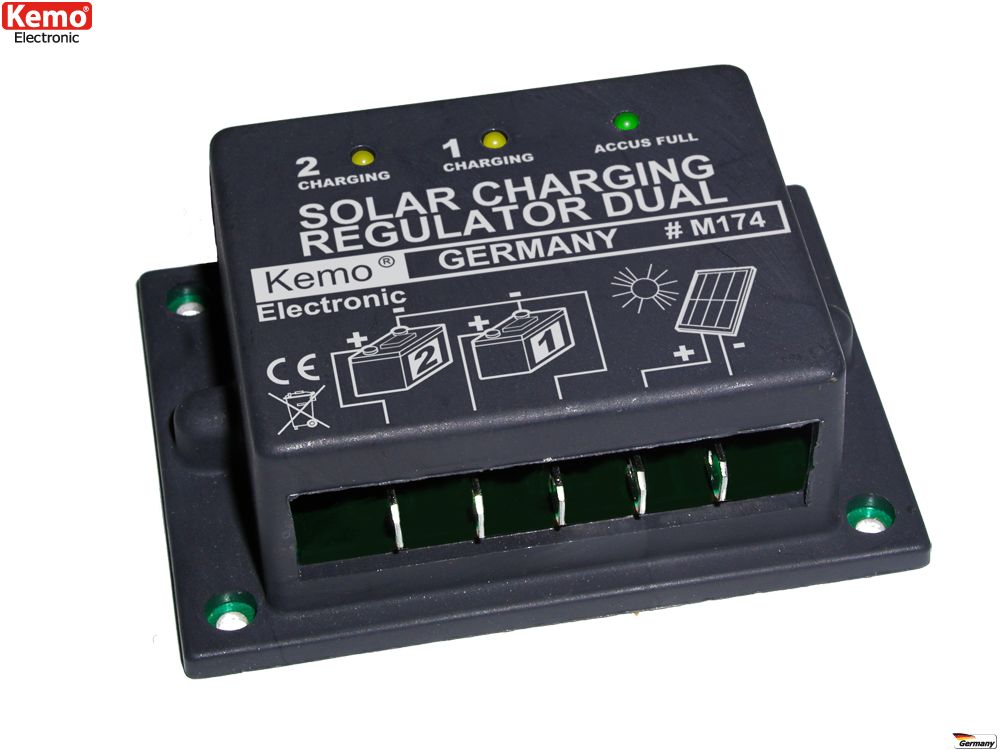 - Klikkaa tarkemmat tiedot https://www.kemo-electronic.de/en/Light-Sound/Solar/M174-Solar-charging-regulator-Dual-16-A.php