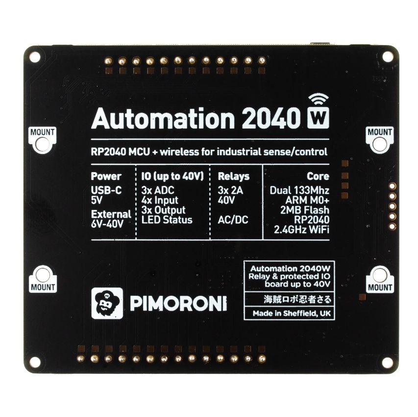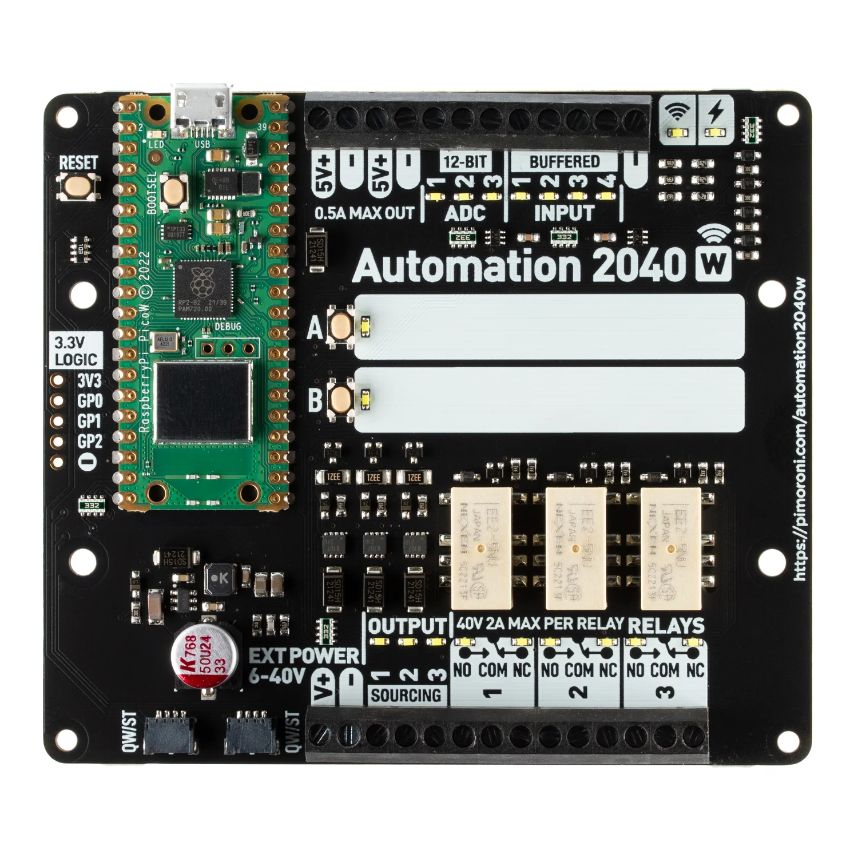 Automation 2040 W on Pico W / RP2040-käyttöinen valvonta- ja automaatiokortti. Se sisältää kaikki Pimoronin Automation HAT:n hienot ominaisuudet(releet, analogiset kanavat, virtalähdöt ja puskuroidut tulot), mutta nyt yhdessä kompaktissa piirilevyssä ja laajennetulla jännitealueella, joten voit käyttää sitä useampien laitteiden kanssa. Soveltuu erinomaisesti tuulettimien, pumppujen, solenoidien, kookkaiden moottoreiden, elektronisten lukkojen tai staattisen LED-valaistuksen ohjaamiseen (jopa 40 V).