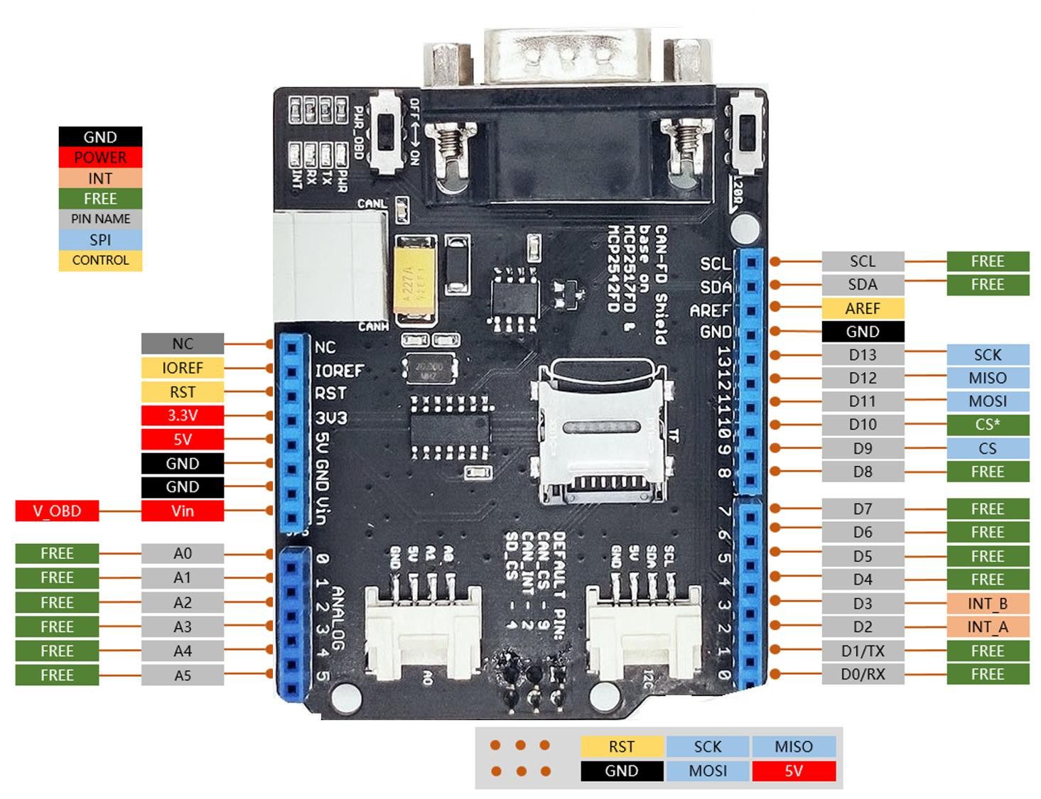 - Flexible Hardware & Usage: Selectable OBD-II and CAN standard pinouts, Adjustable chip select and INT pins