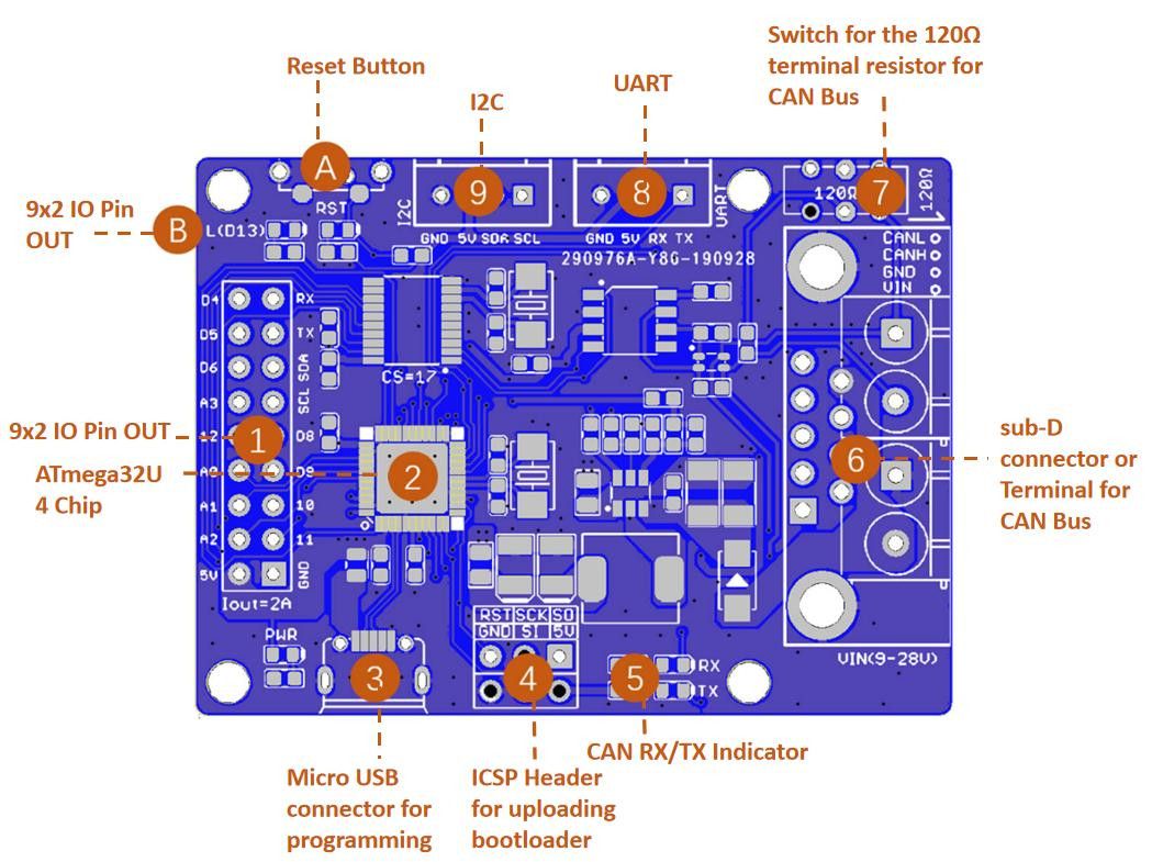Because of the ATmega32U4 onboard chip, this board has rich resources in pins. As a matter of fact, there are 18 pins based on the core chipset up on the board, which include digital pins, analog pins, UART, and an I2C interface. Besides, this CANBed adopts the MCP2515 CAN Bus controller with SPI interface and MCP2551 to achieve the CAN-Bus capability. There are also two kinds of CAN Bus interfaces for various demands which are sub-D9 connector and terminal block interface. They would fit all your needs in the connecting method.