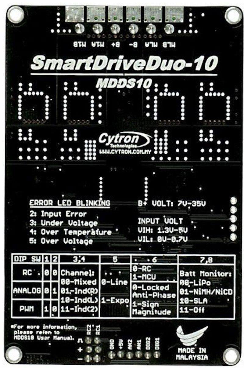 - Klikkaa tarkemmat tiedot https://www.cytron.io/p-10amp-7v-35v-smartdrive-dc-motor-driver-2-channels