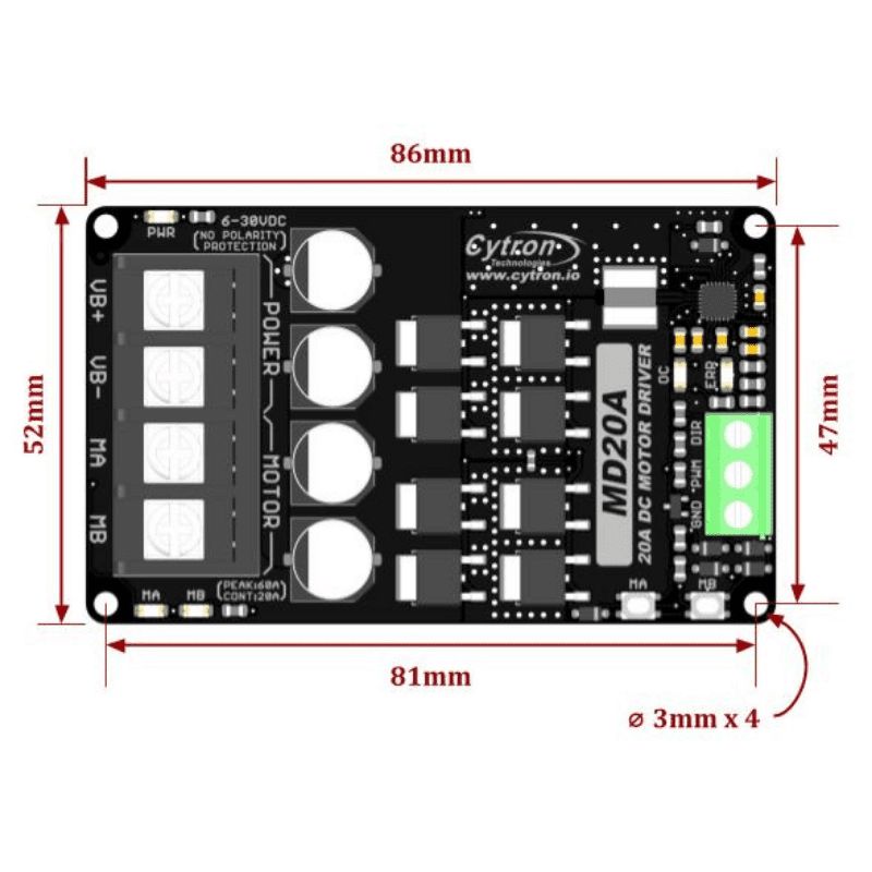The MD20A enables bidirectional control of one high-power brushed DC motor from 6V to 30V. With discrete NMOS H-Bridge design, this motor driver is able to support 20Amp continuously without any heatsink.
