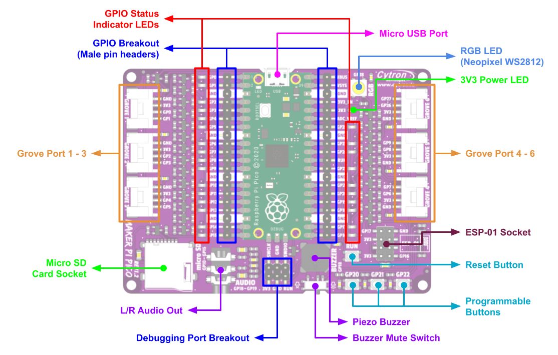 - Tuotepolku Etusivu KehityskortitRaspberry PiRaspberry Pi Pico Cytron Maker Pi Pico: Simplifying Raspberry Pi Pico for Beginners