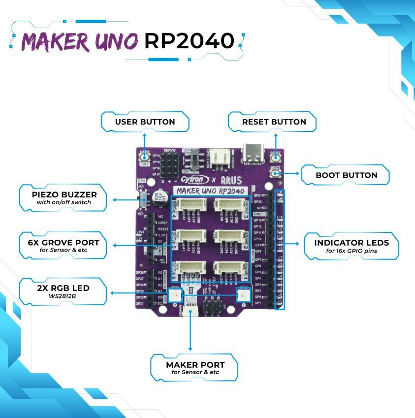 Maker Uno RP2040:n myötä tuomme RP2040-sirun tehoon tuttuun Uno-muotoon. Säilytämme Arduino-alustan suosion tuoneen käyttäjäystävällisyyden ja plug-and-play-ominaisuudet, samalla kun hyödynnämme RP2040:n edistyneitä ominaisuuksia suorituskyvyn parantamiseksi. Lisäksi lisäämme tähän lautaan Maker-sarjan ominaisuuksia ja muita hyödyllisiä ominaisuuksia oppimiskokemuksen parantamiseksi ja luovuutesi herättämiseksi.