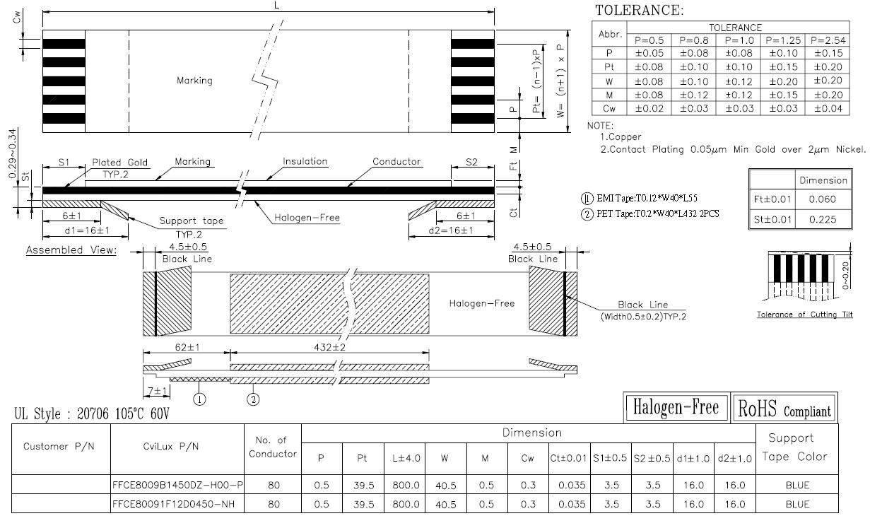 FFC kaapeli 0,5mm 80nap. 80cm Kullattu 55mm EMI suoja