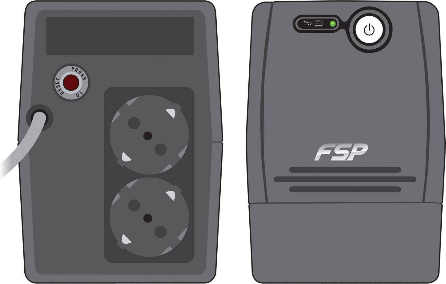 FSP FP800 - 800VA (480W) line-interaktiivinen UPS varavirtalähde yhdellä 12V 9Ah akulla. Kaksi AVR jännitestabiloitua sukolähtöä.