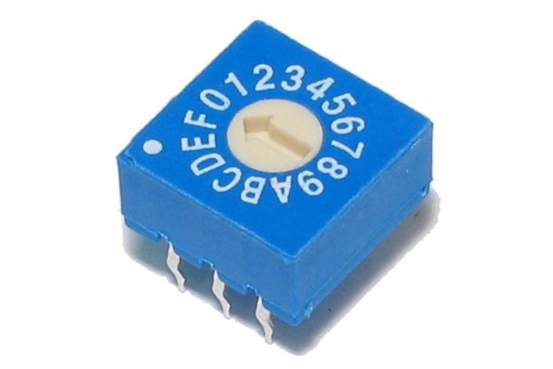 Piirilevylle asennettava 16-asentoinen kiertokytkin. Keskellä kaksi yhteistä jalka ja loput menee binäärisesti kierron position mukaan.