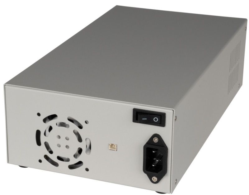 Harmaa metallikotelo Joy-IT RD6012 teholähteelle. Sisältää liittimen, johdotukset, virtakytkimen.