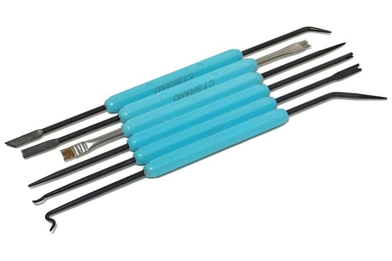 Setissä erilaisia raaputus- ja taivutuskärkiä sisältäen messinki- ja teräsharjat. Puikkojen pituus 180 mm.