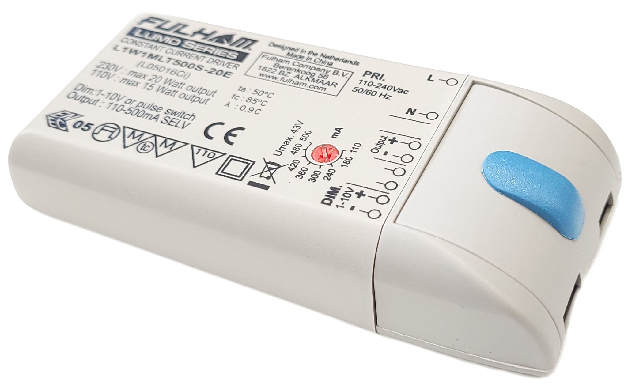 Fulham L1W1MLT500S20E - 20W vakiovirtalähde teholedien ohjaukseen. 110-500mA säädettävissä.