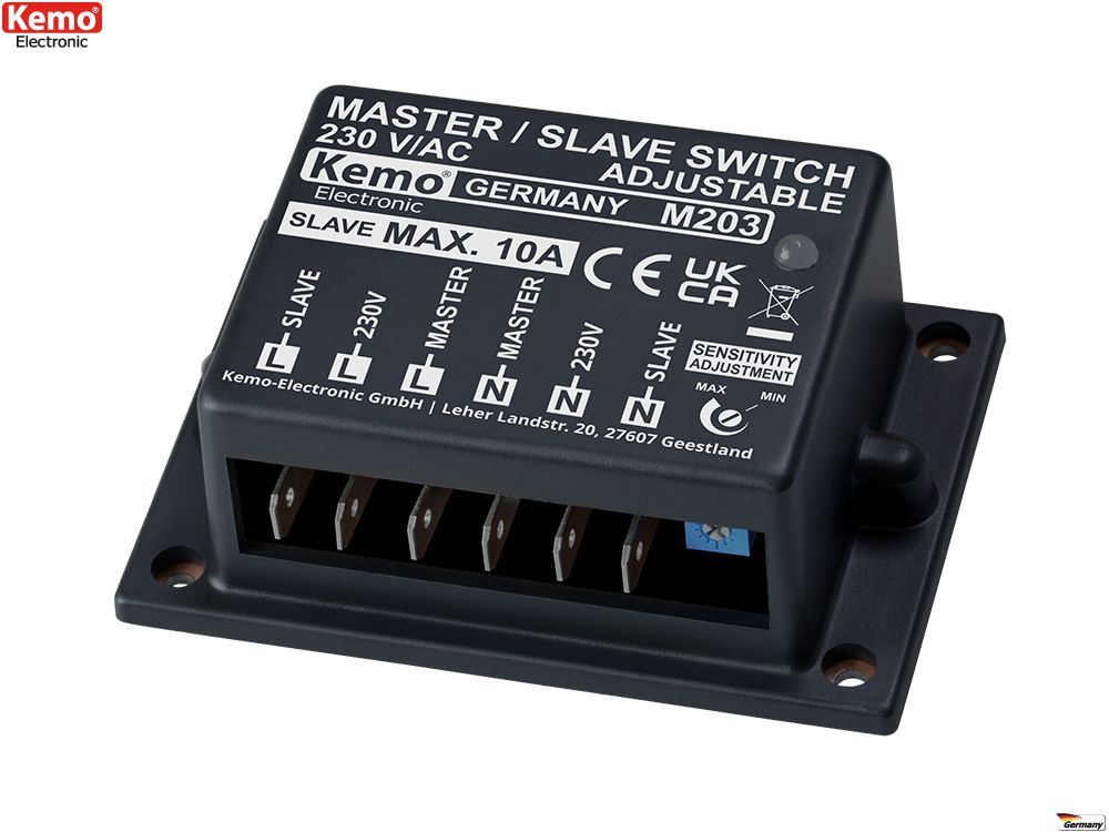 - Klikkaa tarkemmat tiedot https://www.kemo-electronic.de/en/Transformer-Dimmer/Switches/Modules/M203-Master-Slave-Switch-230-V-AC-adjustable.php