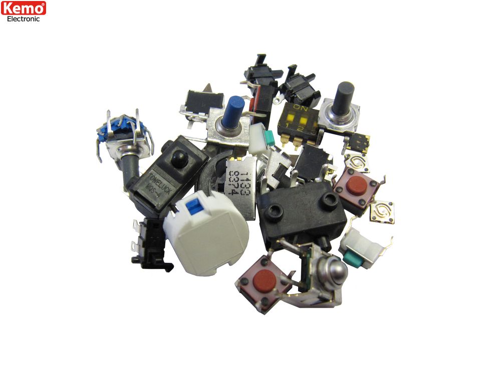 Kemo S104 - harrastuskäyttöön lajitelma erilaisia mikrokytkimiä ja painikkeita. Yhteensä noin 30kpl.