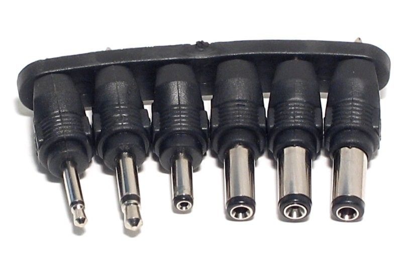 - kuusi yleisintä DC-liitintä: 2,5 ja 3,5 mm monoplugit sekä 2,1 / 2,5 / 1,35 / 1,5 mm DC-liittimet