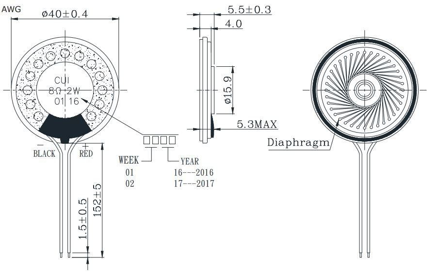 - Klikkaa tarkemmat tiedot https://www.cuidevices.com/product/audio/speakers/miniature-(10-mm~40-mm)/cms-40558n-l152-series/cms-40558n-l152