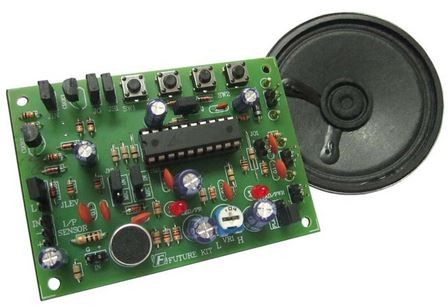 Digitaalinen äänentallennin. Näppäimissä PLAY, REC, ERASE ja FWD -toiminnot. Ledi kertoo painetun toiminnon suorituksen. Äänilähteenä elektreettimikrofoni (tai linjatason audio). Trimmeristä voi säätää tallennuksen pituutta ja/tai toiston nopeutta. Toimii 5-6V jännitteellä. Piirikortti 76 x 55 mm.