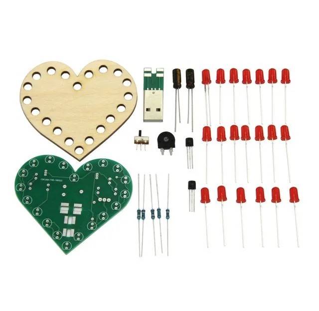 Rakennussarja”vilkkuva sydän”, jossa on välkkyviä kynttilä-LED-valoja, sopii erinomaisesti juotosharjoitteluun, kun juotetaan koottavaa piirilevyä. Tätä varten yli 30 komponenttia juotetaan vaihe vaiheelta yksityiskohtaisen ohjeen mukaisesti piirilevylle. Kun paketti on koottu, sydäntä voidaan käyttää jatkuvassa tai vilkkuvassa tilassa. Mukana toimitettava vanerinen etulevy voidaan koristella halutulla tavalla Mitat: 70 x 70 mm, yli 30 komponenttia. Elektroniikkasarjan ”vilkkuva sydän” virransyöttö hoidetaan powerbankilla tai suoraan USB-liitännästä.