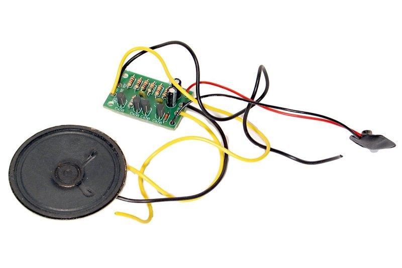 Kun kaksi testijohdinta asetetaan vaikka vesilasiin, rakennussarjan laite tuottaa siniäänen kaiuttimelle.