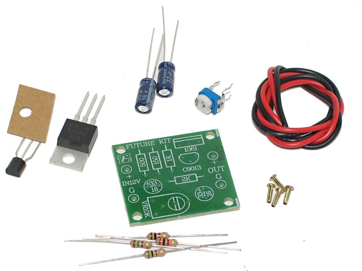 Yksinkertainen säädettävä jänniteregulaattorikytkentä. Toiminta perustuu kahteen NPN-transistoriin ja jännitejakoon. Tuleva jännite 12-15VDC ja säädettävä lähtöjännite 0-12VDC. Kortin mitat 33 x 30 mm.