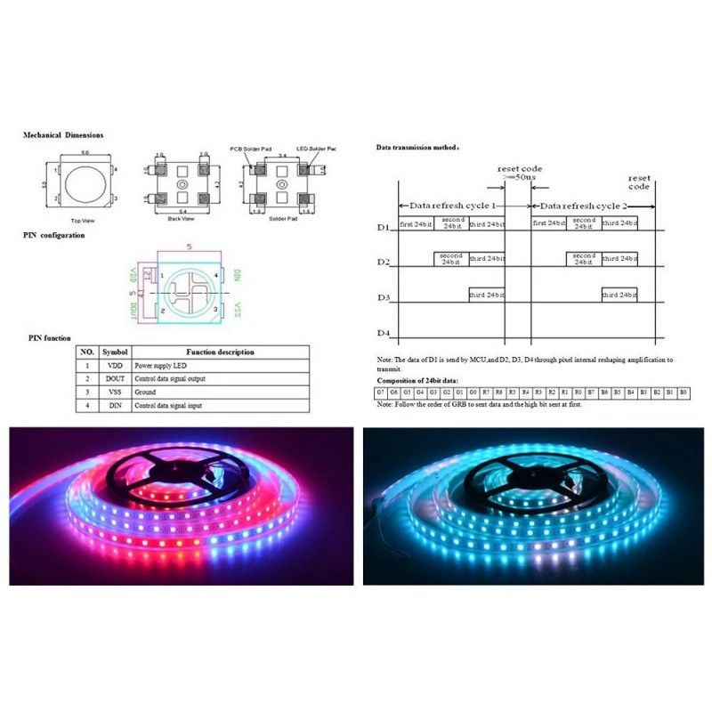 - Tuotepolku Etusivu KomponentitOptiset komponentitLeditOhjattavat ledit RGB-LED WS2812B SMD 5kpl liuska