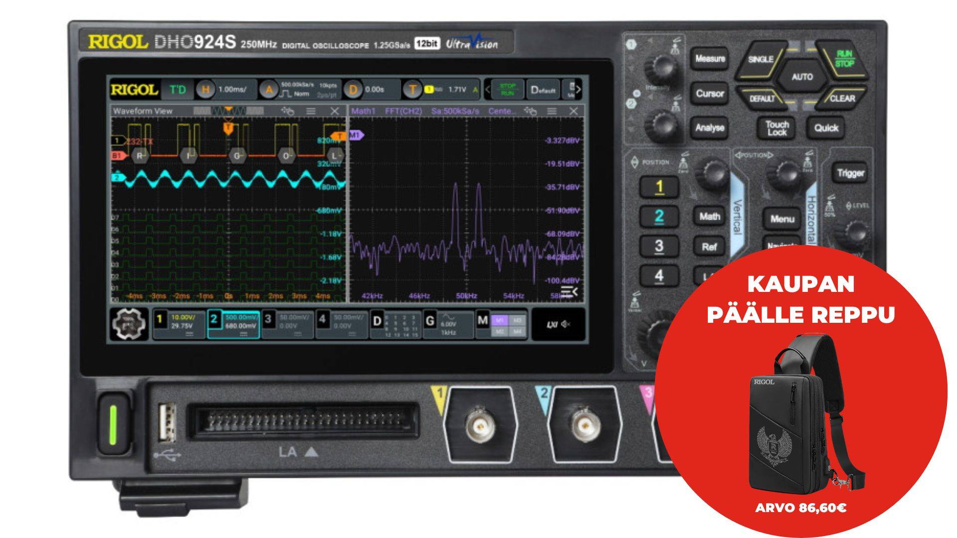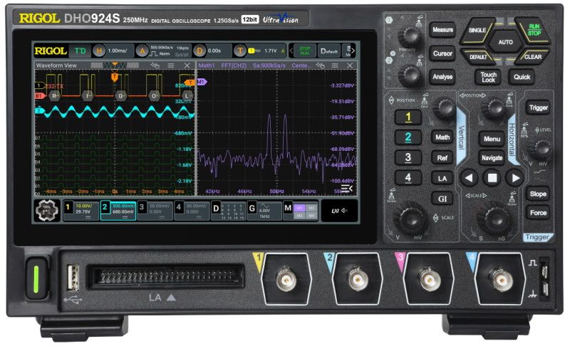 Rigol DHO924S - pienikokoinen, kannettava nelikanavainen oskilloskooppi 250MHz kaistanleveydellä, 12-bittinen ja 1,25 GSA/s näytteistyksellä. Laajennusoptiolla mahdollisuus tuoda 16 digitaalista kanavaa lisää. Tässä mallissa 25MHz signaaligeneraattori.