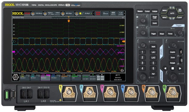 Rigol MHO5106 - uuden sukupolven suorituskykyinen kuusikanavainen sekasignaali oskilloskooppi 1GHz kaistanleveydellä, 12-bitin resoluutiolla ja 4GSa/s näytteistyksellä kaikista kanavista. Mahdollisuus toimia 16-kanavan logiikka-analysaattorina.