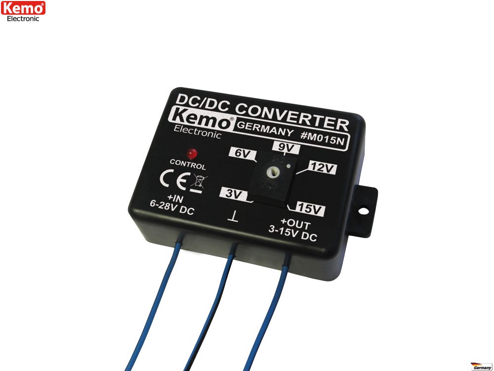 Kemo M015N - säädettävä DC/DC-jännitteenalennin. Tulojännite 6-28VDC, lähtöjännite 3-15VDC, virta maks. 1,5A.