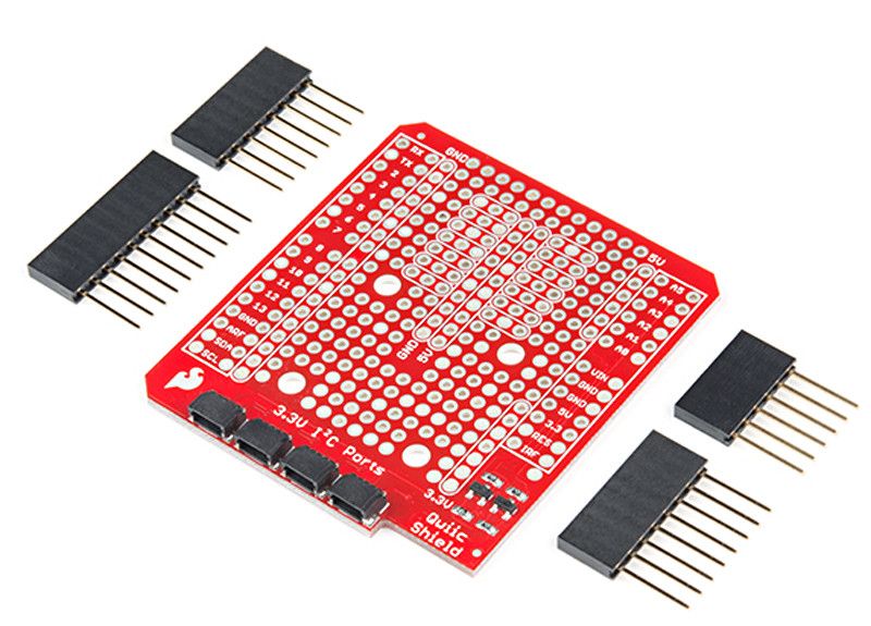 The SparkFun Qwiic Shield is an easy-to-assemble board that provides a simple way to incorporate the Qwiic Connect System with your Arduino Uno. This shield connects the I2C bus on your Arduino to a series of SparkFun Qwiic connectors and provides the circuitry to convert the 5V given to the 3.3V required by I2C boards in our Qwiic system. As long as your devices are on different addresses, the Qwiic system allows for daisy chaining, meaning you can stack as many sensors as you’d like to create a tower of sensing power!