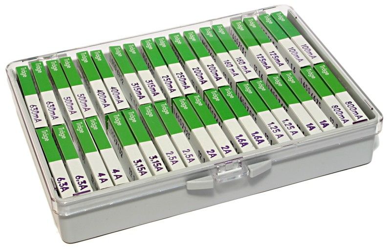 Jokaista arvoa löytyy kaksi vihreällä merkittyä rasiaa. Yhteensä 360 kpl 5x20mm 250VAC lasiputkisulakkeita. Nopeusluokka hidas (= time-lag T). Malliperhe Eska 522 (EN60127-2-3).