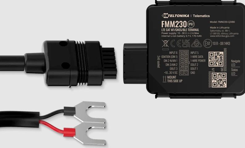 Teltonika FMM230 - on GNSS- ja GSM-yhteydellä varustettu paikannuslaite, joka pystyy keräämään laitteen koordinaatit ja siirtämään ne GSM-verkon kautta palvelimelle. Kiinnitetään suoraan akkuun paketissa olevalla haarukkaliittimillä.