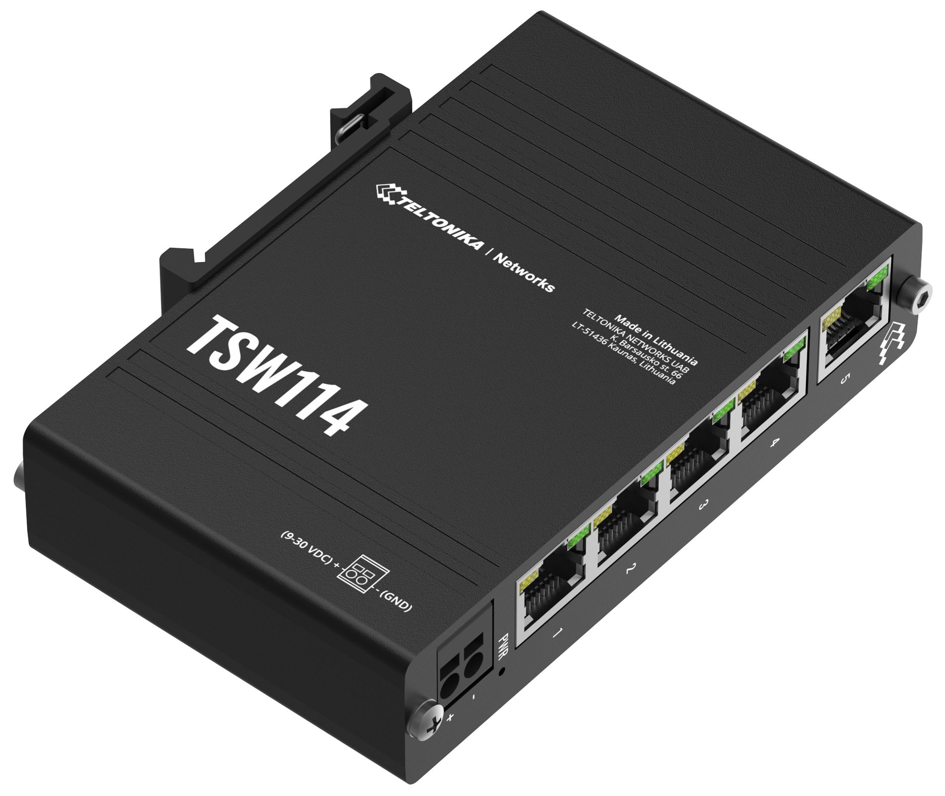 Teltonika TSW114 - DIN-kiskoon asennettava, teollisuusluokan hallitsematon gigabit ethernet kytkin 1+4x1GB RJ45/Ethernet liitännöillä