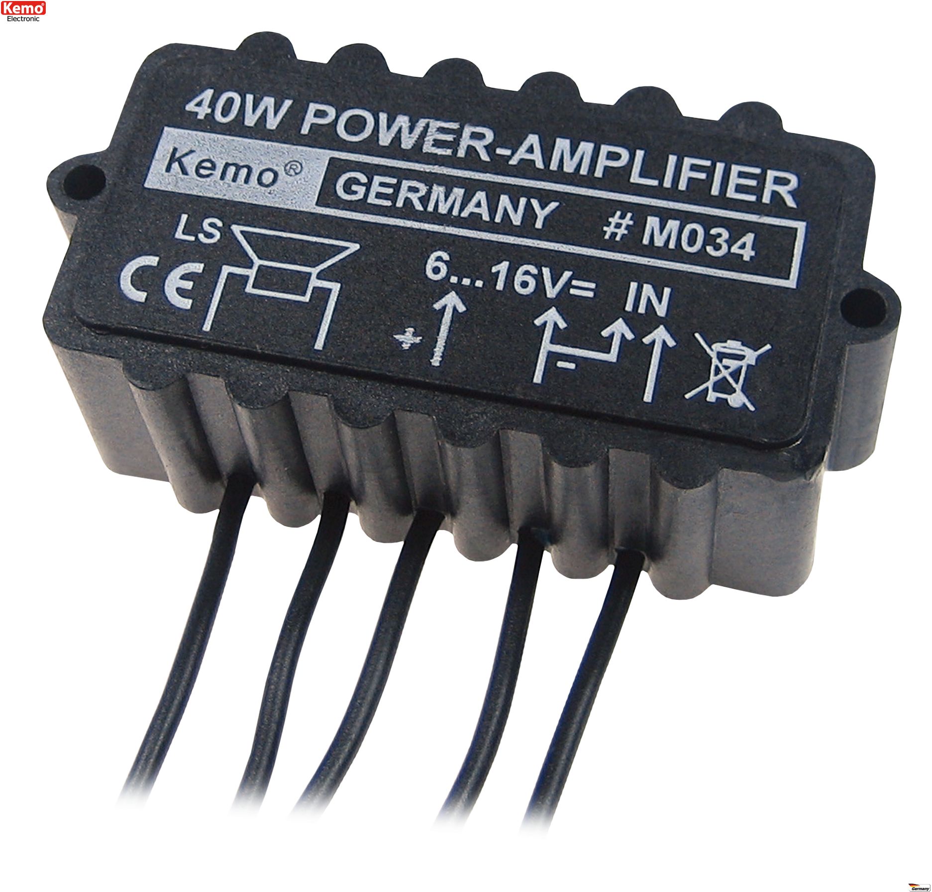 - Klikkaa tarkemmat tiedot https://www.kemo-electronic.de/en/Light-Sound/Amplifier-Splitter/Modules/M034-Amplifier-40-W-universal.php