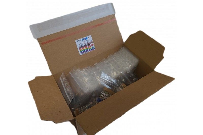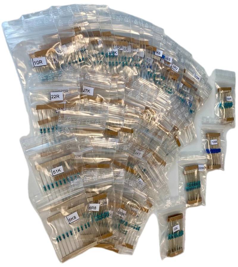 Kattava lajitelma 0,6W metallikalvovastuksia E12 arvosarjan mukaisesti alkaen 1,0 ohmista 10 megaohmiin. Yhteensä 890 kappaletta jaoteltuna arvon mukaisiin tarroitettuihin pusseihin.