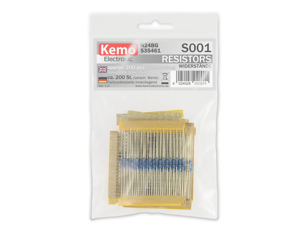 - Klikkaa tarkemmat tiedot https://www.kemo-electronic.de/en/Components/Elements/Resistor/S001-Resistors-approx-200-pieces.php