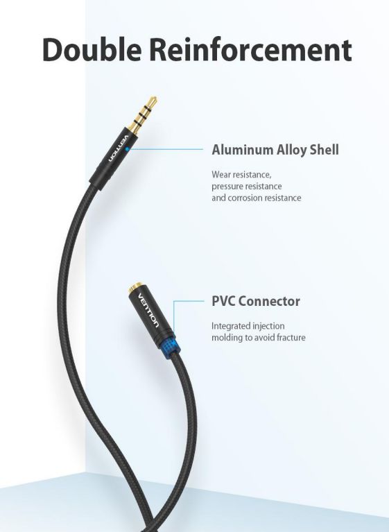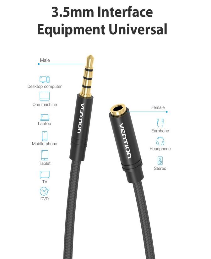 Vention BHBBD kaapelilla jatkat kaapeliasi esim. älypuhelimen ja headsetin välillä. 4-pinin 3,5mm liitin mahdollistaa stereoäänen sekä mikrofonin käytön samalla kaapelilla.