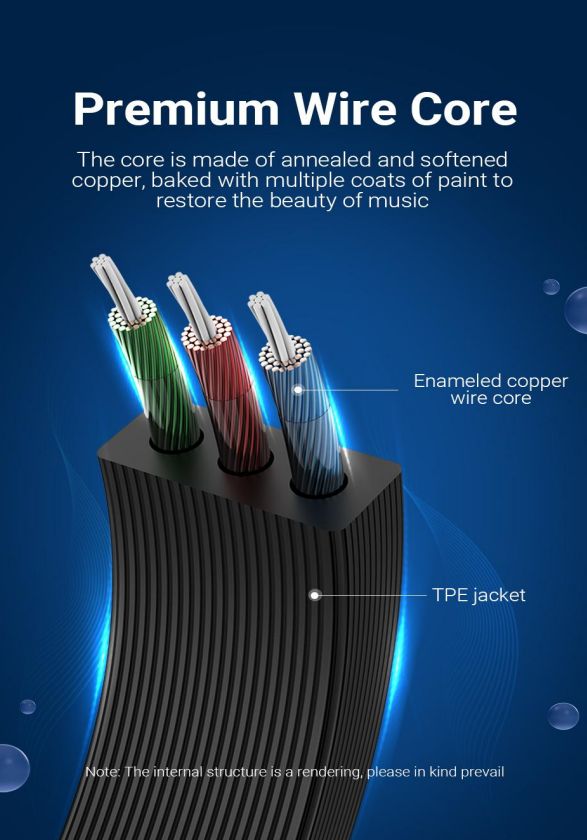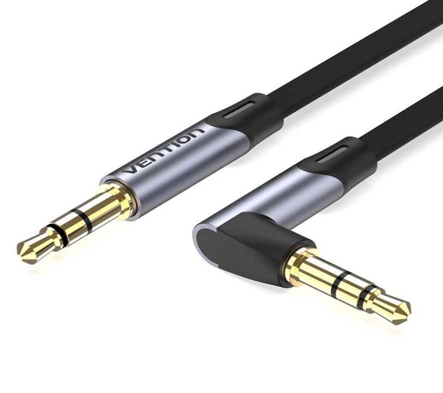 Vention audiojohto analogisen äänisignaalin siirtoon. Johdon molemmissa päissä on 3,5 mm liittimet, joista toinen 90° kulmassa. Suojattu johto takaa optimaalisen, häiriöttömän äänenlaadun.