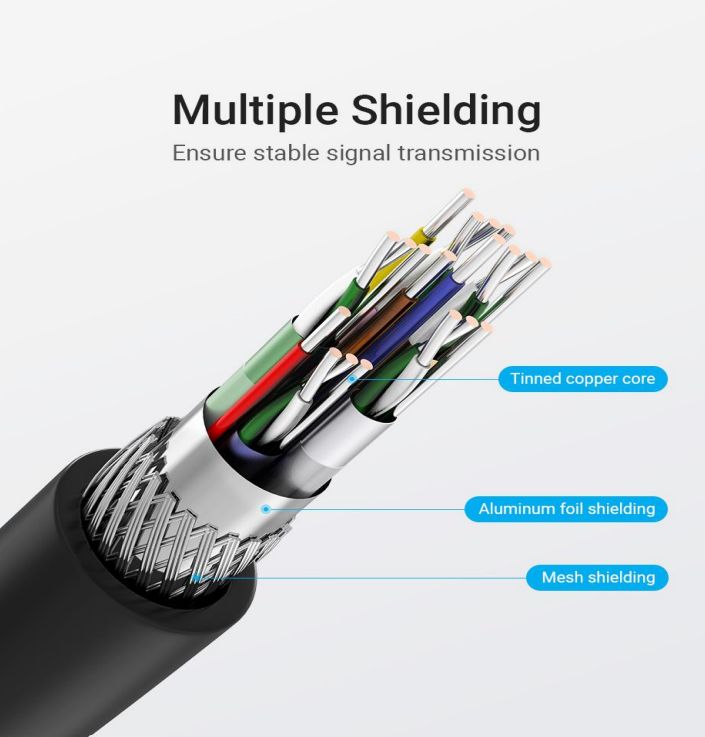 Vention HDMI kaapelissa on kulma-liitin ja se tarjoaa kristallinkirkkaan kuvan. Sen nopeus on jopa 18 Gbps ja se tukee myös HDR ja 60 fps:ää