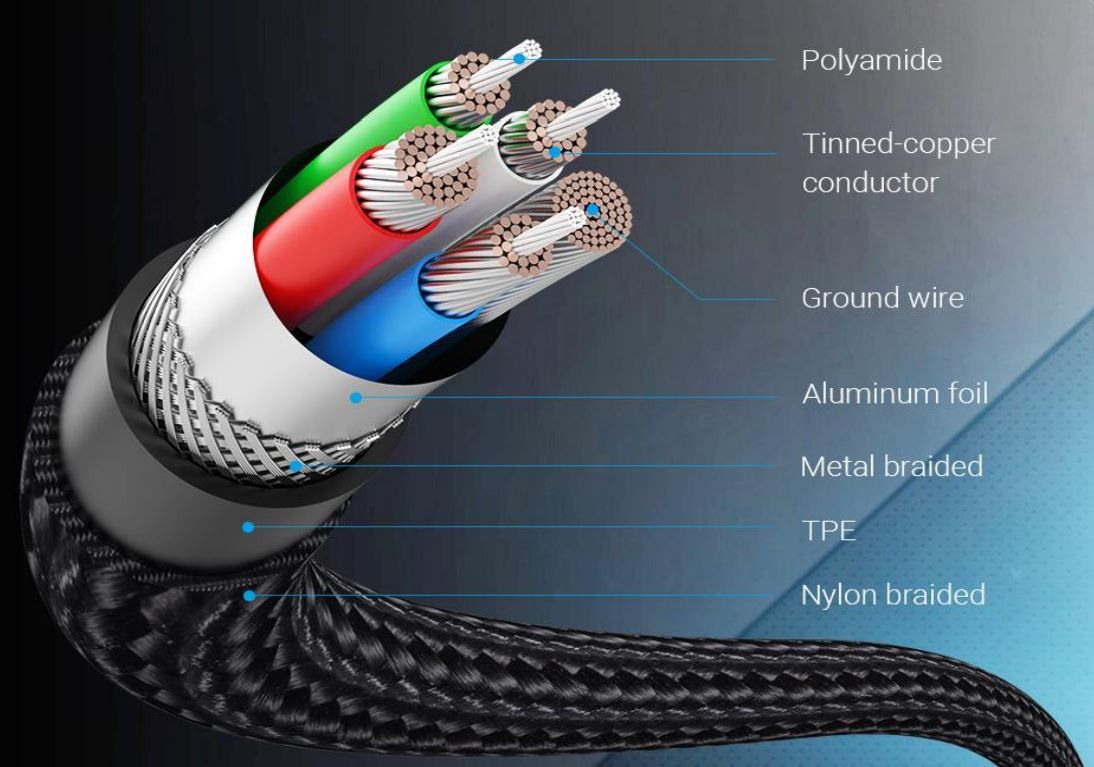 Vention TAEHD - USB 2.0 C/C kaapeli nailon-punotulla TPE vaipalla, tukee 5A ja 100W pikalatausta, väri musta, pituus 0,5m.