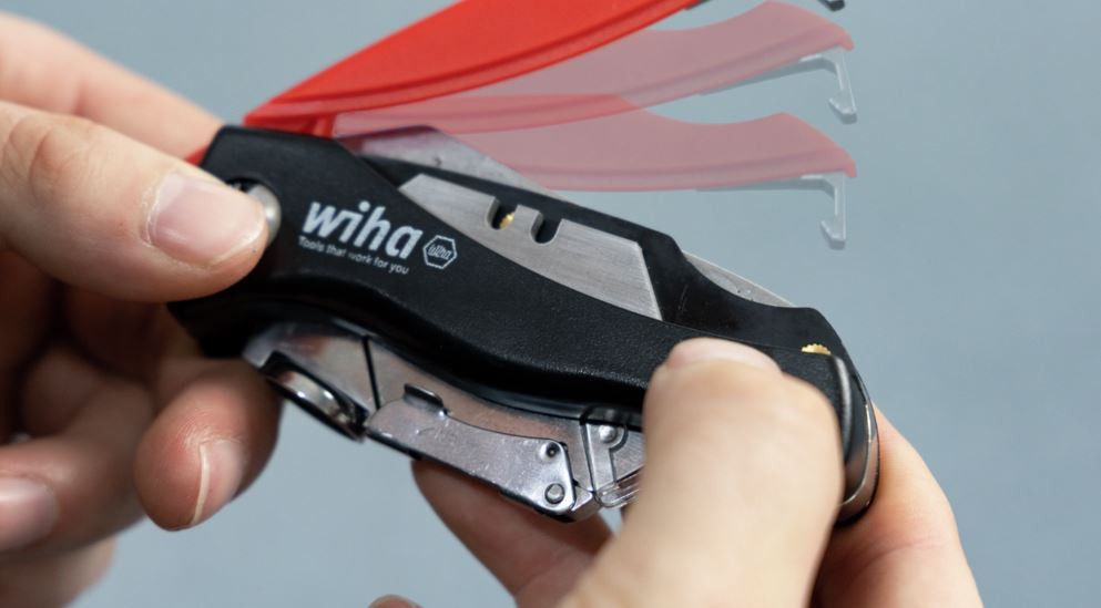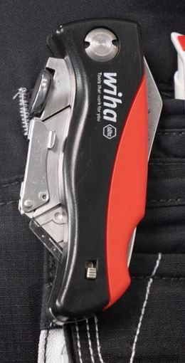 Wiha 45425 - sähköasentajan tarpeisiin sopiva taittoveitsi. Vaihtoterille kahvassa 6kpl säilytyspesä.