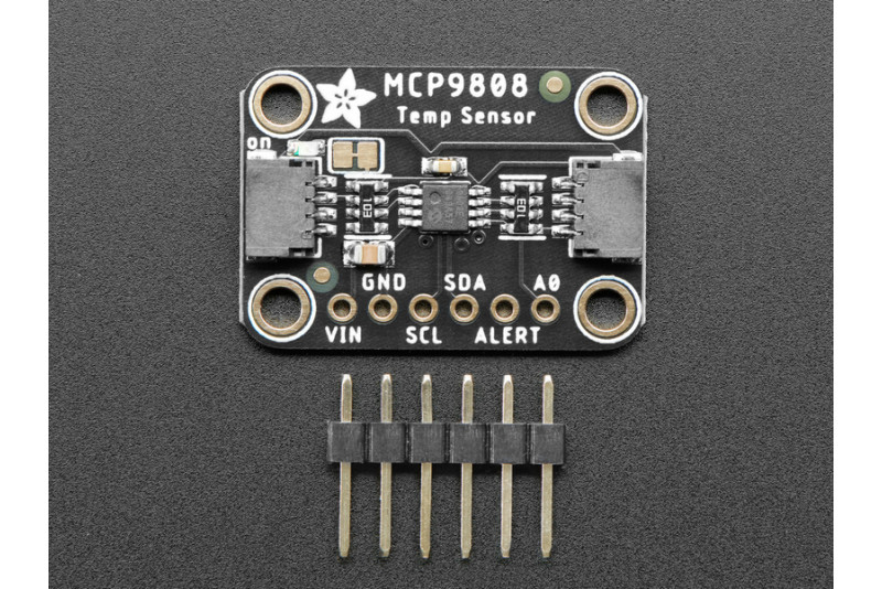 Adafruit MCP9808 is a precise digital temperature sensor capable of measuring from -40 °C to +125 °C with a typical accuracy of ±0.25 °C. With a resolution of 0.0625 °C, it is ideal for applications requiring reliable and fine-grained temperature monitoring. The sensor communicates over I2C and supports up to eight addresses via address pins.