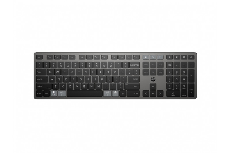 HP HP 725 Rechargeable Multi-Device Wireless Keyboard - A full-size wireless keyboard for multiple devices. It features ultra-fast 3-minute charging, up to 2 months of use, Bluetooth and USB-A connectivity, and programmable keys for productivity.