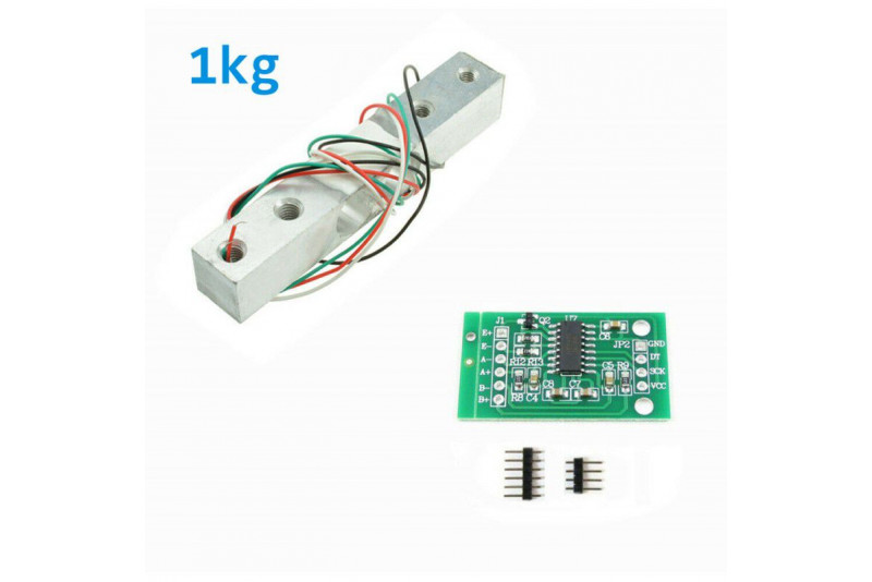Nonetheless, this module is commonly being used to measure weight. The load cell is a straight bar load cell (sometimes called a strain gauge). It can translate up to 1kg of pressure (force) into an electrical signal. Each load cell is able to measure the electrical resistance that changes in response to, and proportional of, the strain (e.g. pressure or force) applied to the bar. With this gauge you will be able to tell just how heavy an object is, if an object's weight changes over time, or if you simply need to sense the presence of an object by measuring strain or load applied to a surface.